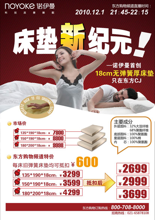 2010-12-1活動內(nèi)容:史無前例!諾伊曼豪華超厚記憶床墊4折起,另外,每床舊彈簧床墊均可抵扣600元。!諾伊曼為你送上冬日里的無限溫暖!超值特惠,只在東方CJ,僅限一小時!還等什么,快快搶購吧!產(chǎn)品明細(xì):品名尺寸現(xiàn)價原價抵扣價諾伊曼豪華零壓力床墊135*190*18CM329978002699150*190*1...[繼續(xù)閱讀]